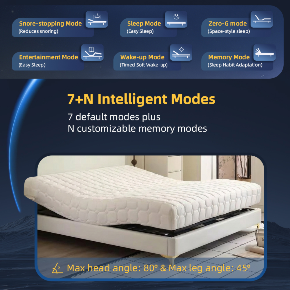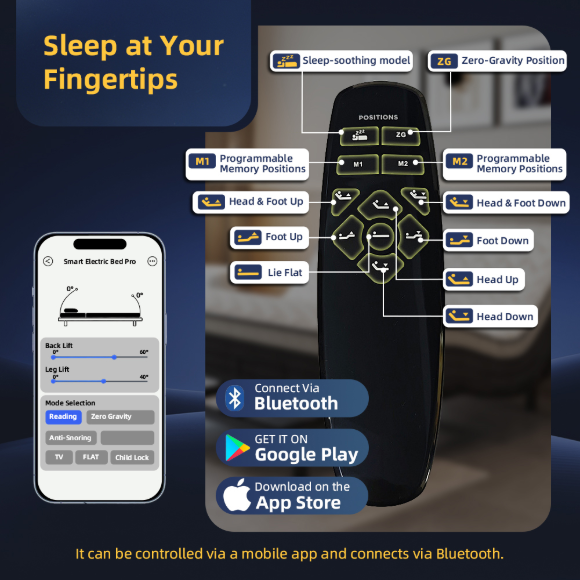 (支持模式:零重力/太空/睡眠/娱乐/止鼾/唤醒。可通过手机APP、蓝牙或无线遥控器操作。OKIN电机享十年质保)