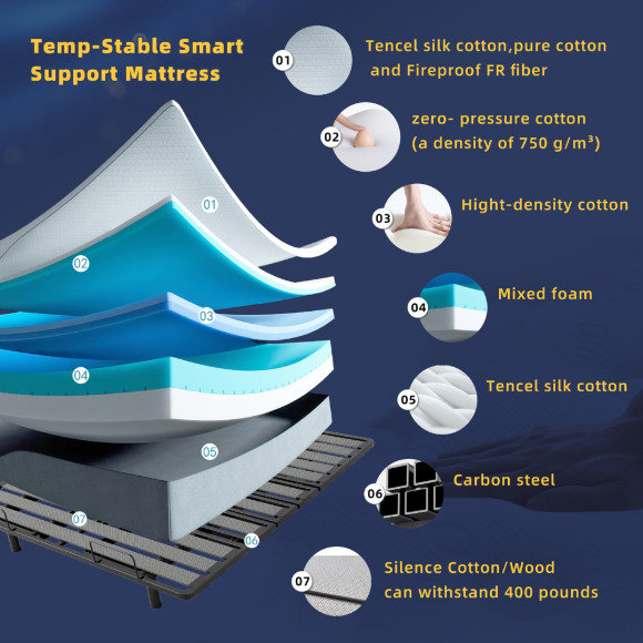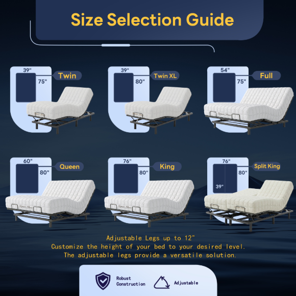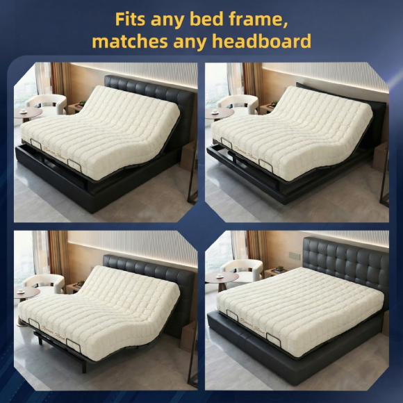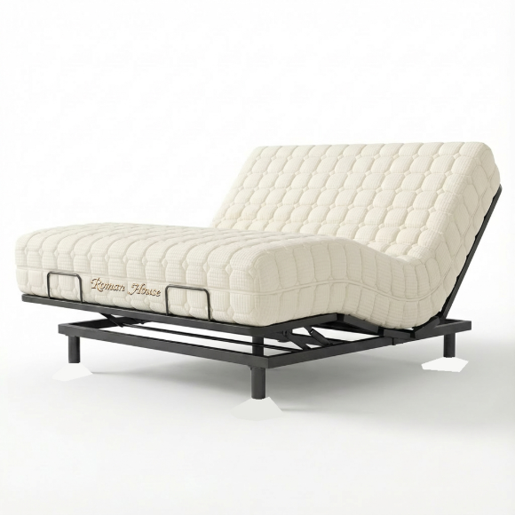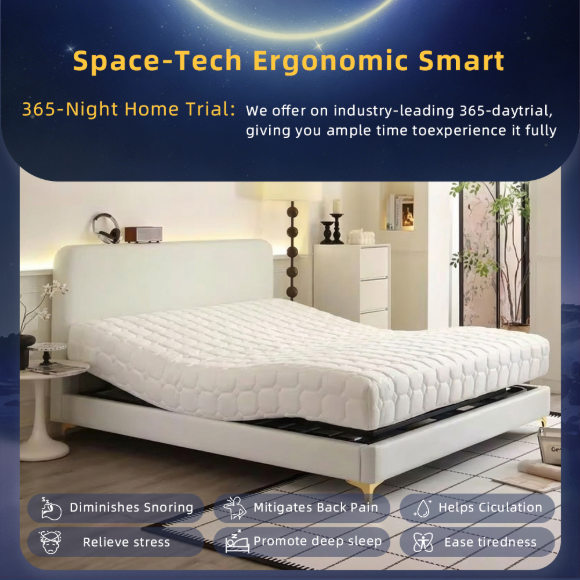 4. 材质配置:智能底座采用不锈钢材质,搭载双OKIN电机确保升降顺滑静音。搭配透气凝胶涂层零压棉与天丝面料床垫,提升空气流通性,保持整夜干爽清凉。可调节床架最大承重达800磅,保障彻夜舒适安眠。